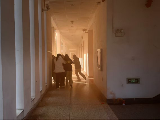 演練當(dāng)日,為了逼真還原地震、火災(zāi)場(chǎng)景,安全工作處在教學(xué)樓燃放了煙霧彈。隨著演練的開始,在第一聲信號(hào)發(fā)出后,同學(xué)們?cè)谳o導(dǎo)員及工作人員的帶領(lǐng)下做好了地震來(lái)臨時(shí)的應(yīng)急避險(xiǎn)動(dòng)作,在5秒鐘之后,第二聲信號(hào)響起,全體同學(xué)掩住口鼻,快速、有序地從各間教室撤離教學(xué)樓。參加本次演練的新生共計(jì)4000余人,三場(chǎng)演練平均用時(shí)1分42秒,演練過(guò)程順利,服從指揮,達(dá)到了預(yù)期的效果。