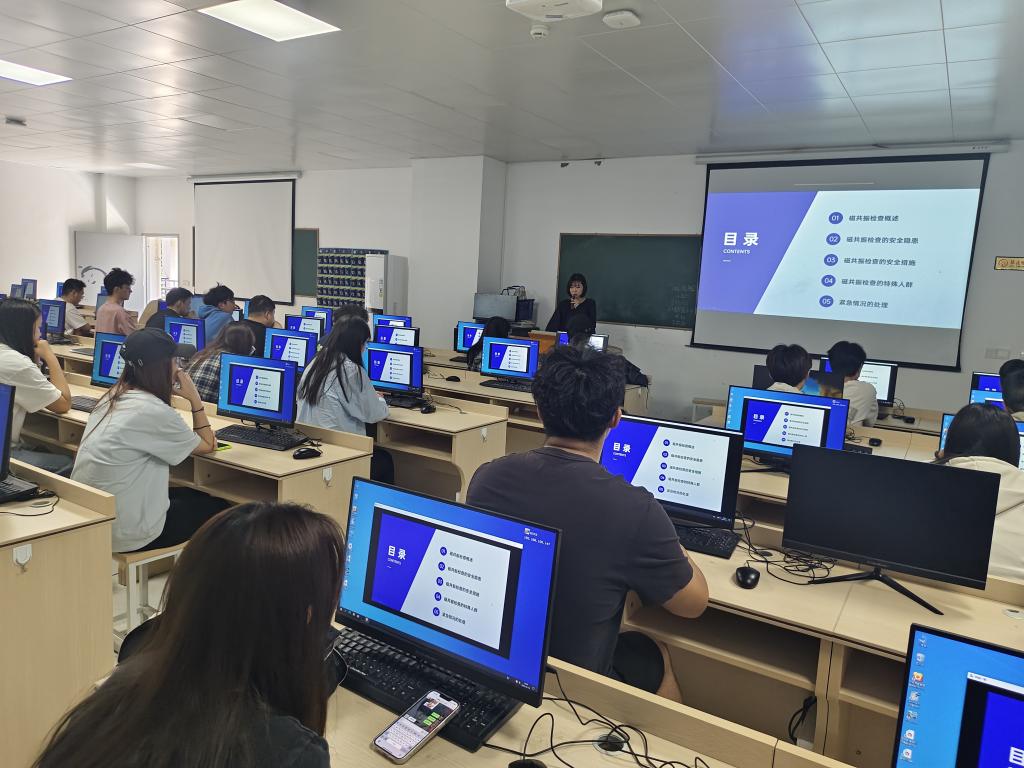 為保證演練活動(dòng)安全、有序進(jìn)行,工作人員事先進(jìn)行周密安排,制定演練方案。本次演練分兩個(gè)部分進(jìn)行。第一部分,磁共振MRI檢查安全演練。首先由醫(yī)學(xué)技術(shù)與工程學(xué)院吳沁老師集中講授實(shí)訓(xùn)過(guò)程中磁共振MRI檢查安全、處理流程及預(yù)防措施。告知學(xué)生發(fā)生MRI檢查意外不要驚慌,聽(tīng)從指揮,完成應(yīng)急處理流程。工作人員維持現(xiàn)場(chǎng)秩序,確保實(shí)訓(xùn)室無(wú)發(fā)生其他安全事件。