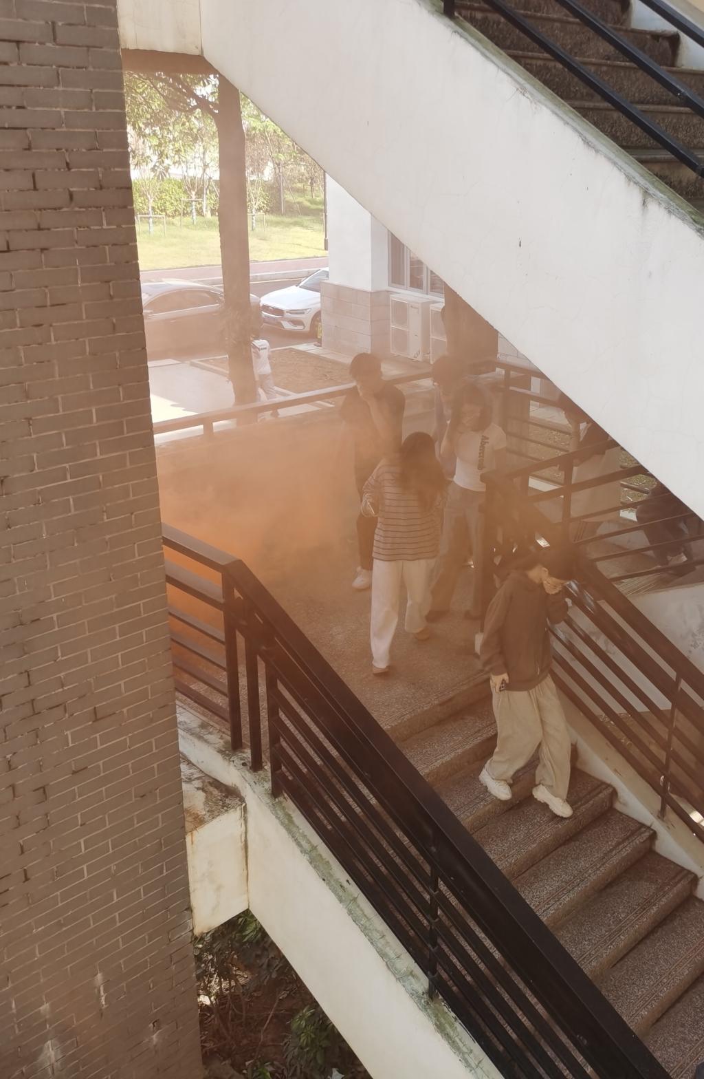 第二部分應(yīng)急逃生演練(消防、地震)。演練開(kāi)啟前安全工作處林澤文先詳細(xì)介紹消防器材的使用、演練程序、疏散信號(hào)、疏散路線、疏散順序等注意事項(xiàng),并強(qiáng)調(diào)在疏散過(guò)程中切勿擁擠、推搡導(dǎo)致踩踏事件發(fā)生。演練工作組接到演練指令后,燃放煙霧,平靜的醫(yī)工學(xué)院樓突然黃煙四起、警報(bào)鈴響,各位老師迅速到達(dá)指定崗位,學(xué)生們也隨之做出反應(yīng),在現(xiàn)場(chǎng)人員的指揮下,學(xué)生們紛紛用手、濕紙巾等捂住口鼻,彎著腰從預(yù)定的逃生路線進(jìn)行撤離,撤退中所有同學(xué)緊靠右行,撤退過(guò)程井然有序,參加本次演練師生全部安全撤離到指定區(qū)域。