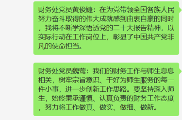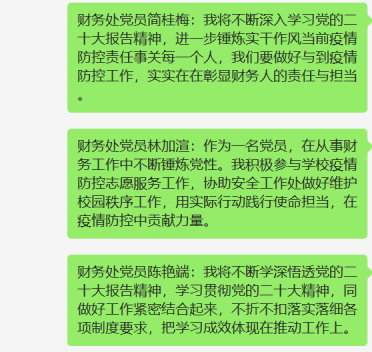 魏鶯同志指出要把學(xué)習(xí)貫徹好黨的二十大精神作為支部當(dāng)前和今后一個(gè)時(shí)期的首要政治任務(wù),將“干實(shí)事、謀實(shí)招、求實(shí)效”的務(wù)實(shí)作風(fēng)和飽滿的精神狀態(tài)投入到工作中去。在當(dāng)前疫情防控形勢嚴(yán)峻的緊要關(guān)頭,我們要以黨的二十大精神為指引,持續(xù)做好疫情防控各項(xiàng)保障服務(wù)工作。要采取更多惠師生、暖師生舉措,立足本職,以提升財(cái)務(wù)服務(wù)工作為抓手,著力解決好師生急難愁盼問題,努力推動(dòng)學(xué)校高質(zhì)量發(fā)展。