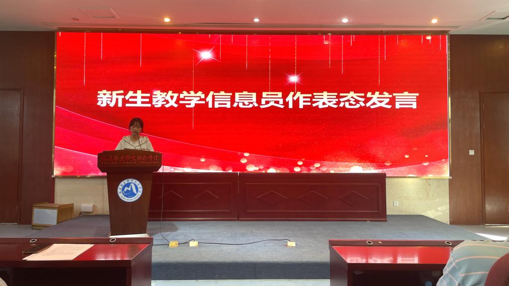 新生學(xué)生信息員代表林晨芳發(fā)表表態(tài)發(fā)言,她代表新生學(xué)生信息員表態(tài)將盡職盡責(zé),認(rèn)真履行信息員的職責(zé),積極參與教學(xué)管理工作,為提高教學(xué)質(zhì)量貢獻自己的力量。