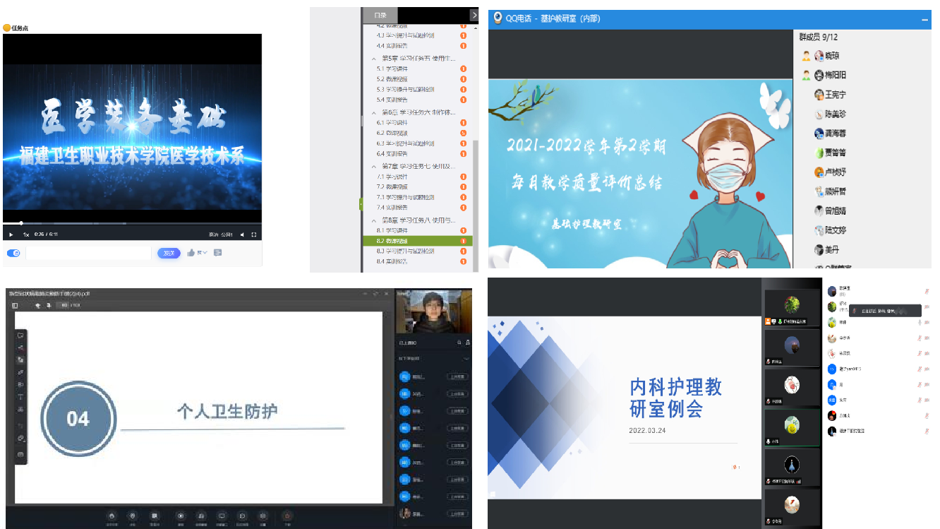 在線上教學過程中,“雙帶頭人”教師黨支部書記牽頭各教研室,積極探索最優(yōu)教學模式,集體線上備課,共同研討教學內(nèi)容和教學進度,研究線上實習模式和適用平臺,開展實習生線上實習準備工作。護理學院兩位“雙帶頭人”支部書記帶頭參與線上教學督導,課后就各課程的教學情況做出點評,并與任課教師交流經(jīng)驗、指導教學工作,著力提升教學品質(zhì);因疫情無法開展線下實訓課,黨員教師們積極引導護理學院學生在宿舍就地取材,利用玩偶、枕頭等進行模擬實訓,做到理論實踐相結(jié)合。醫(yī)學技術(shù)系第二黨支部在支部書記鐘偉雄的帶動下,積極推進專業(yè)建設(shè),開展智能醫(yī)療裝備技術(shù)專業(yè)和醫(yī)用電子儀器技術(shù)專業(yè)的線上人才培養(yǎng)方案制定會,同時在學習通平臺開設(shè)《醫(yī)學裝備基礎(chǔ)》線上課程,錄制教學實訓視頻,利用虛擬仿真手段開展線上理論授課和實訓教學。