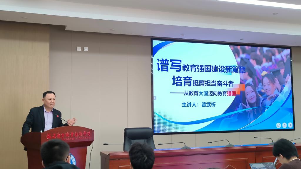 曾武祈以《譜寫(xiě)教育強(qiáng)國(guó)建設(shè)新篇章 培育挺膺擔(dān)當(dāng)奮斗者——從教育大國(guó)邁向教育強(qiáng)國(guó)》為題,圍繞“堅(jiān)實(shí)基礎(chǔ) 戰(zhàn)略支撐”“蓬勃發(fā)展 優(yōu)質(zhì)均衡”“深化改革 系統(tǒng)推進(jìn)”“錨定目標(biāo) 篤行實(shí)干”四個(gè)維度系統(tǒng)闡釋了教育強(qiáng)國(guó)的戰(zhàn)略意義與實(shí)踐路徑。他強(qiáng)調(diào),建設(shè)教育強(qiáng)國(guó)是實(shí)現(xiàn)中華民族偉大復(fù)興的基礎(chǔ)工程,高校作為人才培養(yǎng)主陣地,要堅(jiān)持黨建引領(lǐng),將思政教育貫穿育人全過(guò)程,著力培養(yǎng) “政治堅(jiān)定、技術(shù)精湛、醫(yī)德高尚”的新時(shí)代醫(yī)藥衛(wèi)生人才,在扎實(shí)推進(jìn)教育強(qiáng)國(guó)的過(guò)程中,鑄牢中華民族共同體意識(shí)。