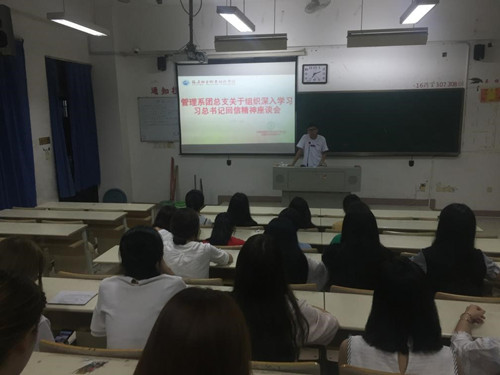 為迎接和學(xué)習(xí)宣傳貫徹黨的十九大精神,充分的學(xué)習(xí)到深刻領(lǐng)會(huì)習(xí)近平總書記回信的精神實(shí)質(zhì)和豐富內(nèi)涵,堅(jiān)定理想信念,錘煉意志品質(zhì)。2017912日,管理系團(tuán)總支書記邱麟老師組織總支委員會(huì)議,組織學(xué)習(xí)了習(xí)近平總書記給第三屆中國(guó)“互聯(lián)網(wǎng)+”大學(xué)生創(chuàng)新創(chuàng)業(yè)大賽“青年紅色筑夢(mèng)之旅”的大學(xué)生的回信,通知安排管理系團(tuán)總支四位學(xué)生委員走進(jìn)2016級(jí)四個(gè)班級(jí)進(jìn)行深入學(xué)習(xí)宣傳貫徹習(xí)近平總書記的回信精神。