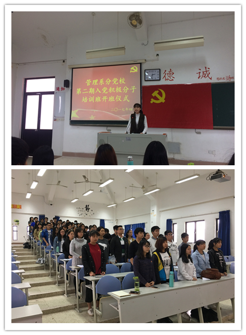 4月27日下午,管理系分黨校第二期培訓(xùn)班開班儀式在教學(xué)樓309教隆重舉行。管理系黨總支艾松軍副書記,黨總支組織委員、學(xué)生黨支部書記揭金花老師,黨總支宣傳委員吳晶老師,教工黨支部書記、團(tuán)總支書記邱麟老師,團(tuán)總支副書記馮瑞華老師以及15級、16級部分學(xué)生先進(jìn)分子參加培訓(xùn)班開班儀式。