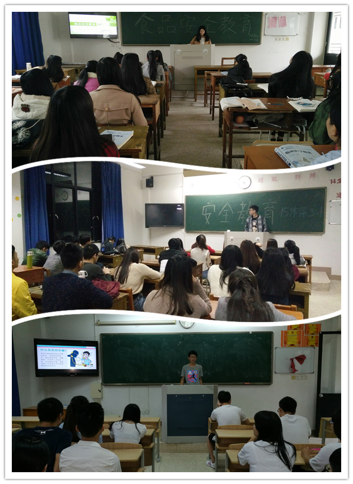 此次班會(huì)形式以觀看視頻、主題ppt演講、以及現(xiàn)場互動(dòng)為主。班會(huì)開始后,由各班班長對(duì)生活中不同方面的安全進(jìn)行簡要介紹,其中15美容301班是以食品安全為主題,用“病從口入”的相關(guān)典例,提示同學(xué)們食品衛(wèi)生的重要性;而15衛(wèi)管301班則是以校園詐騙為主題,列舉了現(xiàn)實(shí)中的相關(guān)案例,告誡同學(xué)們切不可貪小便宜等。然后視屏觀看形象的向同學(xué)們講述了校園周邊存在的一些安全隱患和校園的安全常識(shí),讓同學(xué)們進(jìn)一步認(rèn)識(shí)到在日常生活中防患于未然的重要性和生命的脆弱與可貴,及時(shí)的為同學(xué)們敲醒了安全的警鐘!之后同學(xué)們之間展開互動(dòng)環(huán)節(jié),結(jié)合自身經(jīng)歷,說出了在我們的日常生活中可能存在的隱患,讓同學(xué)們認(rèn)識(shí)到自己在安全防范方面存在的不足,從而達(dá)到提高同學(xué)們安全防范的目的。在同學(xué)們的積極參與中,安全教育主題班會(huì)畫上了圓滿的句號(hào)。