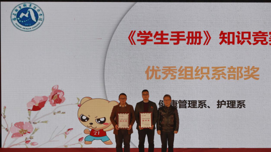 此外,我系在第三屆易班《學(xué)生手冊》知識競賽中榮獲“組織獎(jiǎng)”,輔導(dǎo)員王開曄、張凱捷、李芳琴榮獲“優(yōu)秀組織者”稱號,19健康管理301班榮獲一等獎(jiǎng);19預(yù)防301班、19美容301班榮獲二等獎(jiǎng);19預(yù)防302班、19健康管理302班榮獲三等獎(jiǎng)。