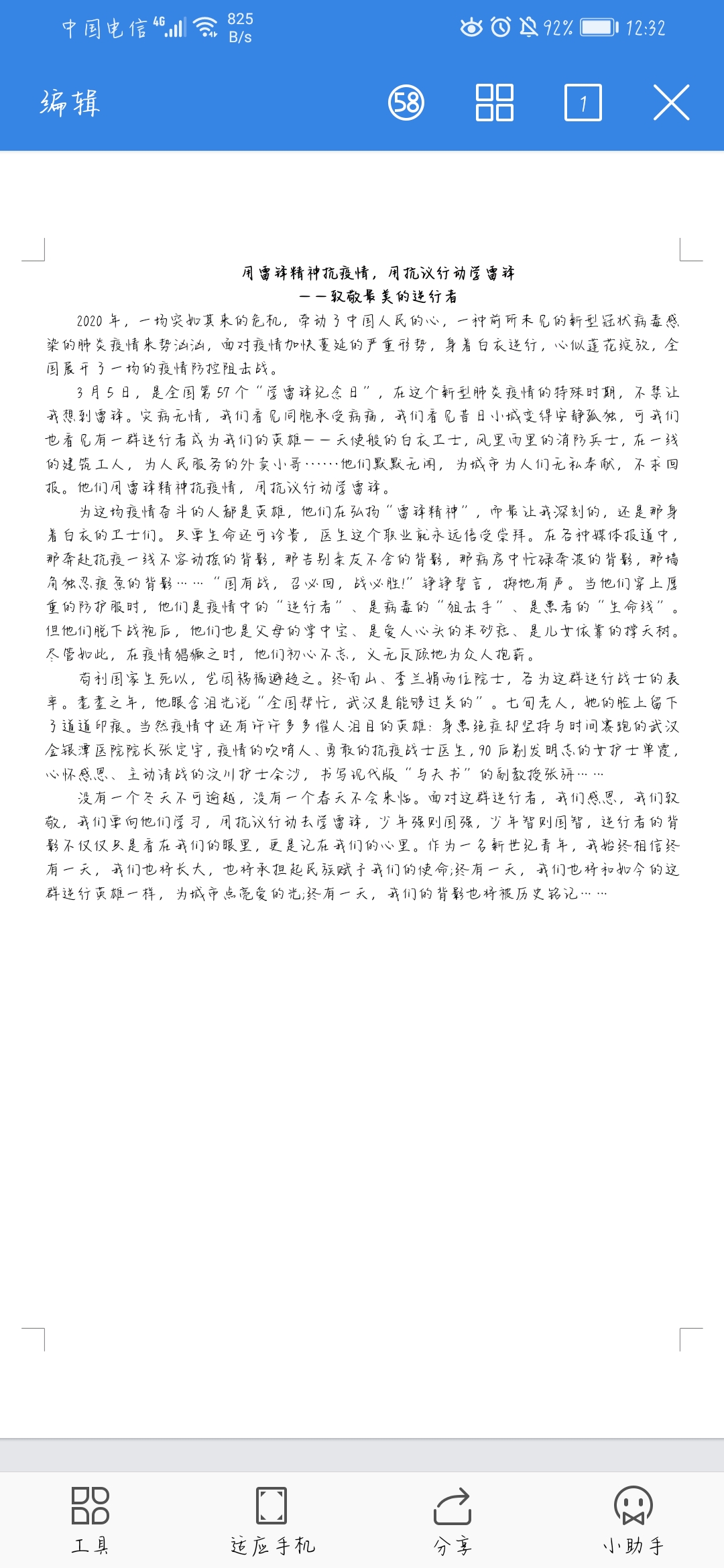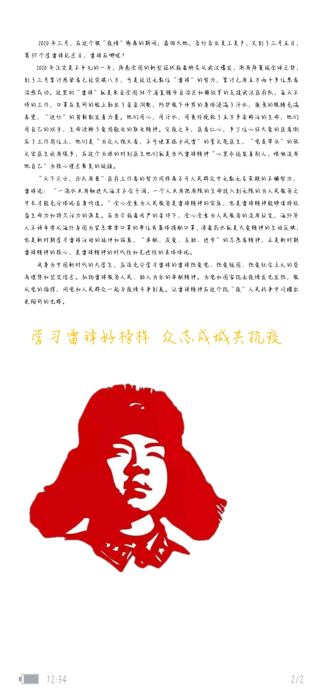 通過(guò)此次線上征文比賽使同學(xué)們認(rèn)識(shí)到抗擊疫情需要全社會(huì)的共同參與,雷鋒精神是中國(guó)精神的突出代表,面對(duì)突然而來(lái)的疫情,作為一名大學(xué)生,我們將傳承雷鋒精神,凝聚起全面抗擊疫情的重要力量,奏響抗疫最強(qiáng)音!