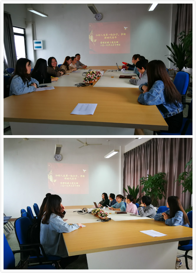 為了深入學習宣傳貫徹習近平新時代中國特色社會主義思想和黨的十九大精神,牢記總書記關于“扣好人生第一??圩印钡慕虒?,2019314日,管理系教工黨支部開展“扣好人生第一??圩?,爭做新時代青年”主題黨日活動。此次活動由教工黨支部書記馮瑞華同志主持。