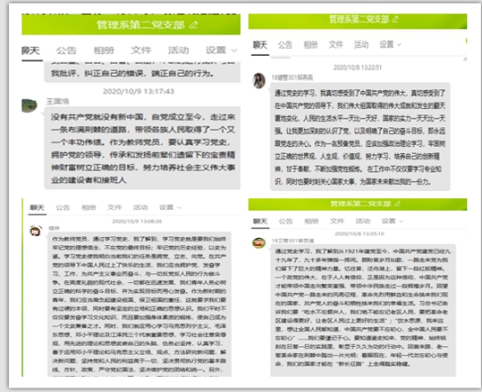 2020年10月8日,管理系第二黨支部全體黨員利用網(wǎng)絡(luò)資源學(xué)習(xí)四史中的《黨史》。學(xué)習(xí)完畢,黨員們紛紛發(fā)表自己的心得體會。