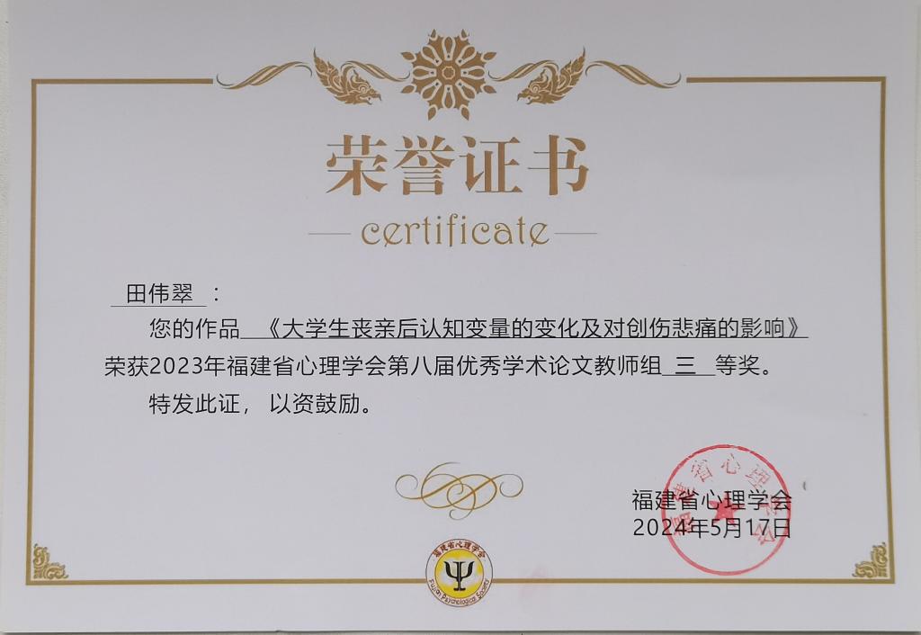 近日,福建省心理學會關于2023年“心服務,新福建”優(yōu)秀社會實踐項目成果和第八屆優(yōu)秀學術論文評選落下帷幕。經福建省心理學會理事專家評審、常務理事會和理事會審議,我校公共衛(wèi)生與健康管理學院報送的社會實踐項目成果《心理服務進軍營,溫暖傳遞“心”能量》榮獲優(yōu)秀社會實踐項目成果三等獎;田偉翠老師報送的學術論文《大學生喪親后認知變量的變化及對創(chuàng)傷悲痛的影響》榮獲第八屆優(yōu)秀學術論文教師組三等獎。