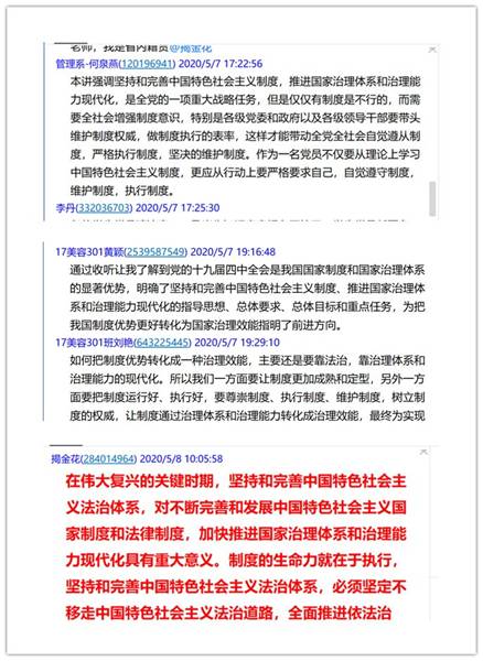 理論學(xué)習(xí)后,同志們?cè)诰€交流了學(xué)習(xí)體會(huì)。管理系第一黨支部副書記揭金花表示,在偉大復(fù)興的關(guān)鍵時(shí)期,堅(jiān)持和完善中國(guó)特色社會(huì)主義法治體系,對(duì)不斷完善和發(fā)展中國(guó)特色社會(huì)主義國(guó)家制度和法律制度,加快推進(jìn)國(guó)家治理體系和治理能力現(xiàn)代化具有重大意義。制度的生命力就在于執(zhí)行,堅(jiān)持和完善中國(guó)特色社會(huì)主義法治體系,必須堅(jiān)定不移走中國(guó)特色社會(huì)主義法治道路,全面推進(jìn)依法治國(guó),堅(jiān)持依法治國(guó)、依法執(zhí)政、依法行政共同推進(jìn),堅(jiān)持法治國(guó)家、法治政府、法治社會(huì)一體建設(shè),全面推進(jìn)科學(xué)立法、嚴(yán)格執(zhí)法、公正司法、全民守法。黨員特別是干部要帶頭尊法學(xué)法守法用法,提高運(yùn)用法治思維和法治方式解決問題的能力,充分發(fā)揮“關(guān)鍵少數(shù)”的表率作用。黨員何泉燕表示,本講強(qiáng)調(diào)堅(jiān)持和完善中國(guó)特色社會(huì)主義制度,推進(jìn)國(guó)家治理體系和治理能力現(xiàn)代化,是全黨的一項(xiàng)重大戰(zhàn)略任務(wù),但是僅僅有制度是不行的,而需要全社會(huì)增強(qiáng)制度意識(shí),特別是各級(jí)黨委和政府以及各級(jí)領(lǐng)導(dǎo)干部要帶頭維護(hù)制度權(quán)威,做制度執(zhí)行的表率,這樣才能帶動(dòng)全黨全社會(huì)自覺遵從制度,嚴(yán)格執(zhí)行制度,堅(jiān)決的維護(hù)制度。作為一名黨員不僅要從理論上學(xué)習(xí)中國(guó)特色社會(huì)主義制度,更應(yīng)從行動(dòng)上要嚴(yán)格要求自己,自覺遵守制度,維護(hù)制度,執(zhí)行制度。預(yù)備黨員劉艷同學(xué)表示,如何把制度優(yōu)勢(shì)轉(zhuǎn)化成一種治理效能,主要還是要靠法治,靠治理體系和治理能力的現(xiàn)代化。所以我們一方面要讓制度更加成熟和定型,另外一方面要把制度運(yùn)行好、執(zhí)行好,要尊崇制度、執(zhí)行制度、維護(hù)制度,樹立制度的權(quán)威,讓制度通過(guò)治理體系和治理能力轉(zhuǎn)化成治理效能,最終為實(shí)現(xiàn)建設(shè)現(xiàn)代化法治強(qiáng)國(guó)做出努力。