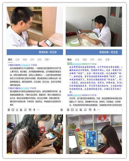 視頻觀看后,黨員們?cè)诰€交流,發(fā)表感想。管理系第一黨支部宣傳委員詹燕婷表示,抗擊新型冠狀病毒感染疫情,讓中華民族力量在凝聚,兇猛的病毒擊不垮團(tuán)結(jié)、堅(jiān)強(qiáng)的中國(guó)人。這是一場(chǎng)艱巨但又必勝的“戰(zhàn)役”,這是一場(chǎng)全民動(dòng)員、眾志成城的“戰(zhàn)斗”。面對(duì)疫情,要牢筑我們的身體和精神“防線”,在黨和政府的領(lǐng)導(dǎo)下,堅(jiān)決打這場(chǎng)疫情防控阻擊戰(zhàn)。作為一名黨員,我們應(yīng)該有擔(dān)當(dāng),有作為,沖鋒在前,爭(zhēng)當(dāng)執(zhí)行防控措施的表率,爭(zhēng)當(dāng)堅(jiān)守崗位的表率,主動(dòng)承擔(dān)黨組織分配的任務(wù),認(rèn)真做好防疫宣傳、正確引導(dǎo)學(xué)生的工作。學(xué)生預(yù)備黨員吳琳琳表示,此次戰(zhàn)疫就像烈火可以鍛煉真金,一場(chǎng)疫情讓我們看到新時(shí)代共產(chǎn)黨人勇于擔(dān)當(dāng)、敢打硬仗、無所畏懼的精神風(fēng)貌。正所謂最危難顯忠誠(chéng)。讓我們更加緊密團(tuán)結(jié)地在以習(xí)近平同志為核心的黨中央周圍,更加緊密地和人民群眾站在一起,越艱難越挺住,越吃勁越堅(jiān)持,眾志成城、全力以赴。