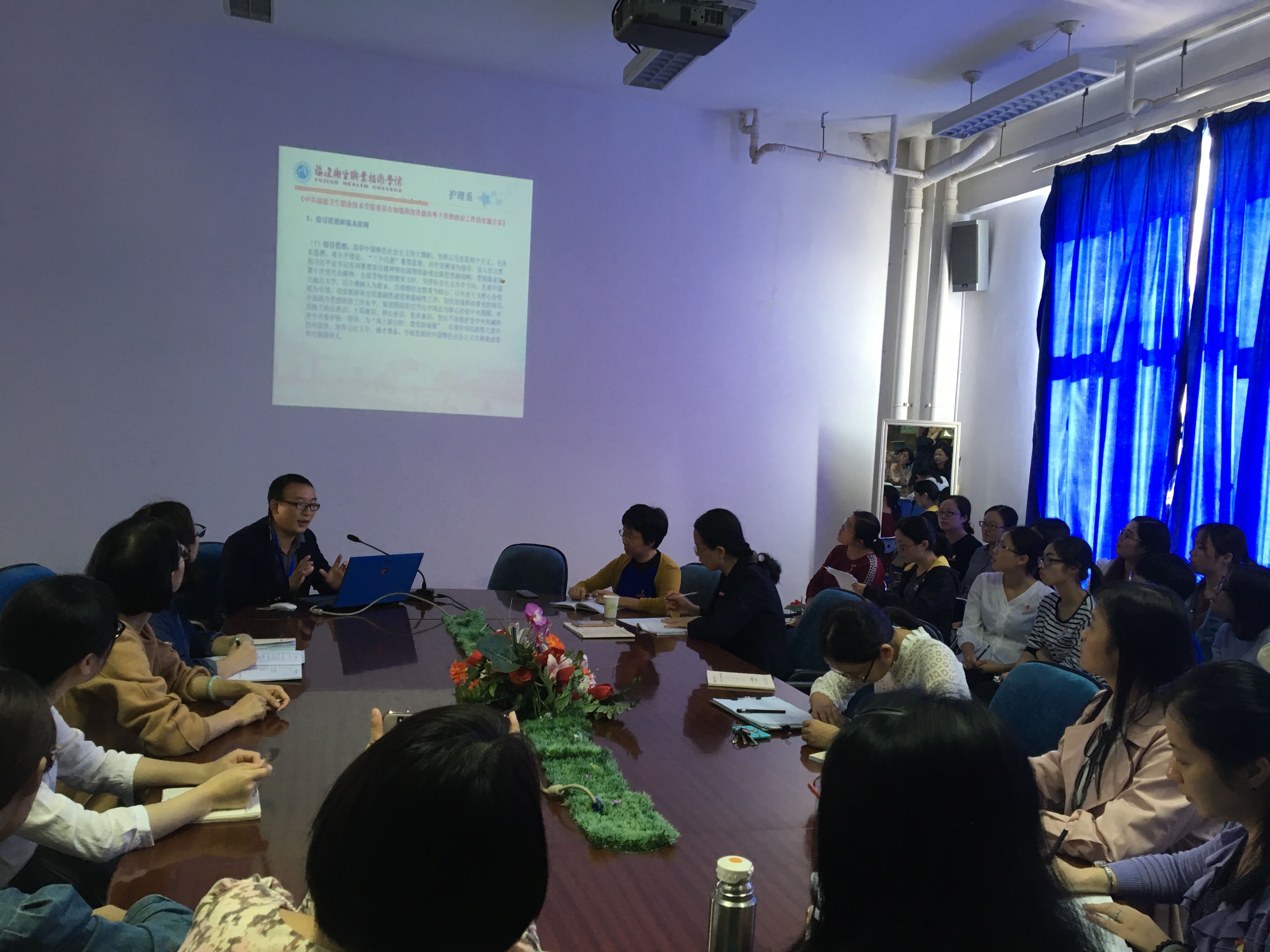 林桂松副書記從“指導(dǎo)思想和基本原則”、“強(qiáng)化思想理論教育和價(jià)值引領(lǐng)”等七個(gè)方面共32條對《中共福建衛(wèi)生職業(yè)技術(shù)學(xué)院委員會(huì)加強(qiáng)和改進(jìn)新形勢下思想政治工作的實(shí)施方案》進(jìn)行了解讀,對抓好理想信念教育、抓好社會(huì)主義核心價(jià)值觀宣傳教育、加強(qiáng)對課堂教學(xué)的建設(shè)管理、提升教師思想政治素質(zhì)和師德水平等方面進(jìn)行了重點(diǎn)解讀和引申;分九個(gè)部分對《福建衛(wèi)生職業(yè)技術(shù)學(xué)院效能建設(shè)管理規(guī)定》(試行)進(jìn)行了解讀,對工作制度部分的十一個(gè)制度進(jìn)行了詳細(xì)的解讀。并要求全系教職工要積極行動(dòng),以習(xí)近平總書記在全國高校思想政治工作會(huì)議上的講話精神、各級(jí)機(jī)關(guān)關(guān)于加強(qiáng)和改進(jìn)新形勢下高校思想政治工作的意見以及學(xué)院的思想政治工作的實(shí)施方案為指導(dǎo),全面做好我系的各項(xiàng)思想政治工作。