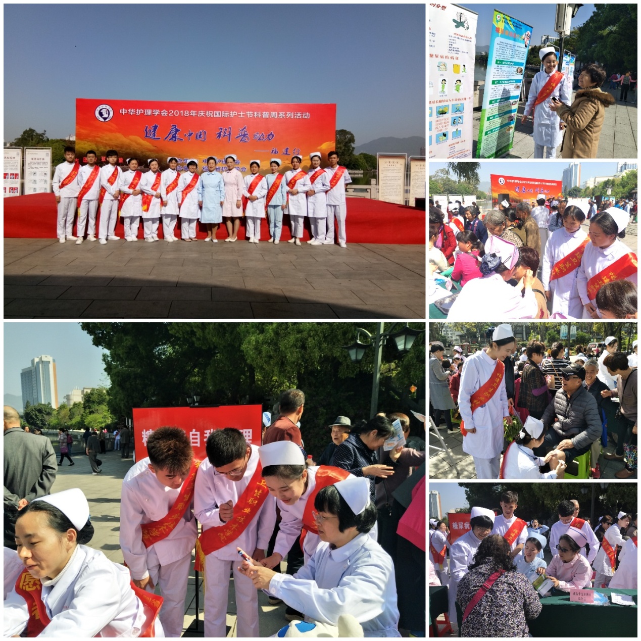 2018年4月8日中華護理學(xué)會在福州西湖舉辦2018年慶祝國際護士節(jié)科普周系列活動。福建衛(wèi)生職業(yè)技術(shù)學(xué)院副院長鄭翠紅教授和護理系黨總支書記謝濤老師帶領(lǐng)護理系部分師生黨員及入黨積極分子參加本次活動?;顒又黝}為:“健康中國,科學(xué)助力”。