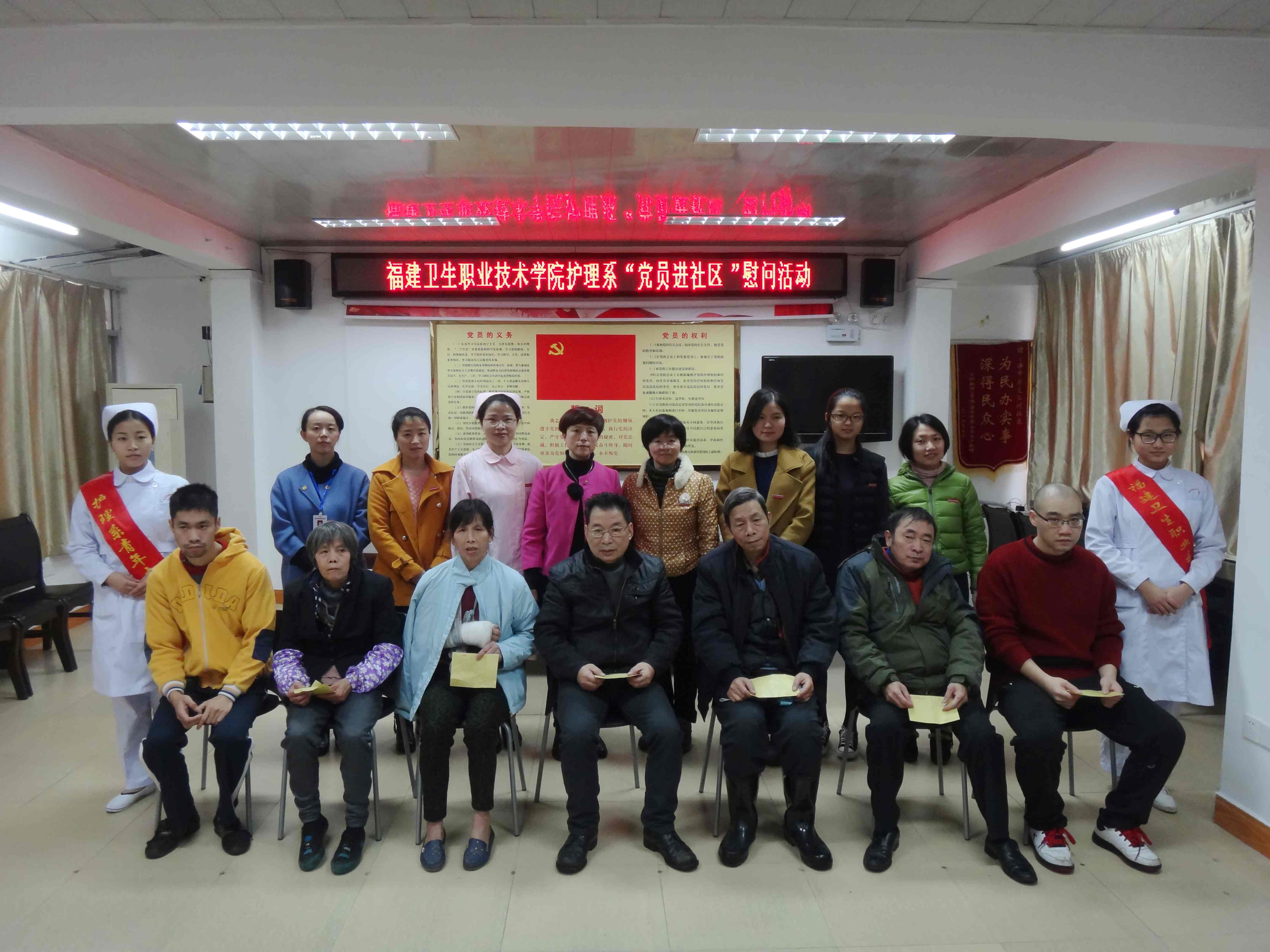 為貫徹落實(shí)黨的群眾路線(xiàn)教育實(shí)踐活動(dòng),護(hù)理系黨總支謝濤書(shū)記帶領(lǐng)著部分黨員,于2015年12月25日上午,到共建單位福州市洋中街道玉樹(shù)社區(qū)開(kāi)展了黨員進(jìn)社區(qū)活動(dòng)。