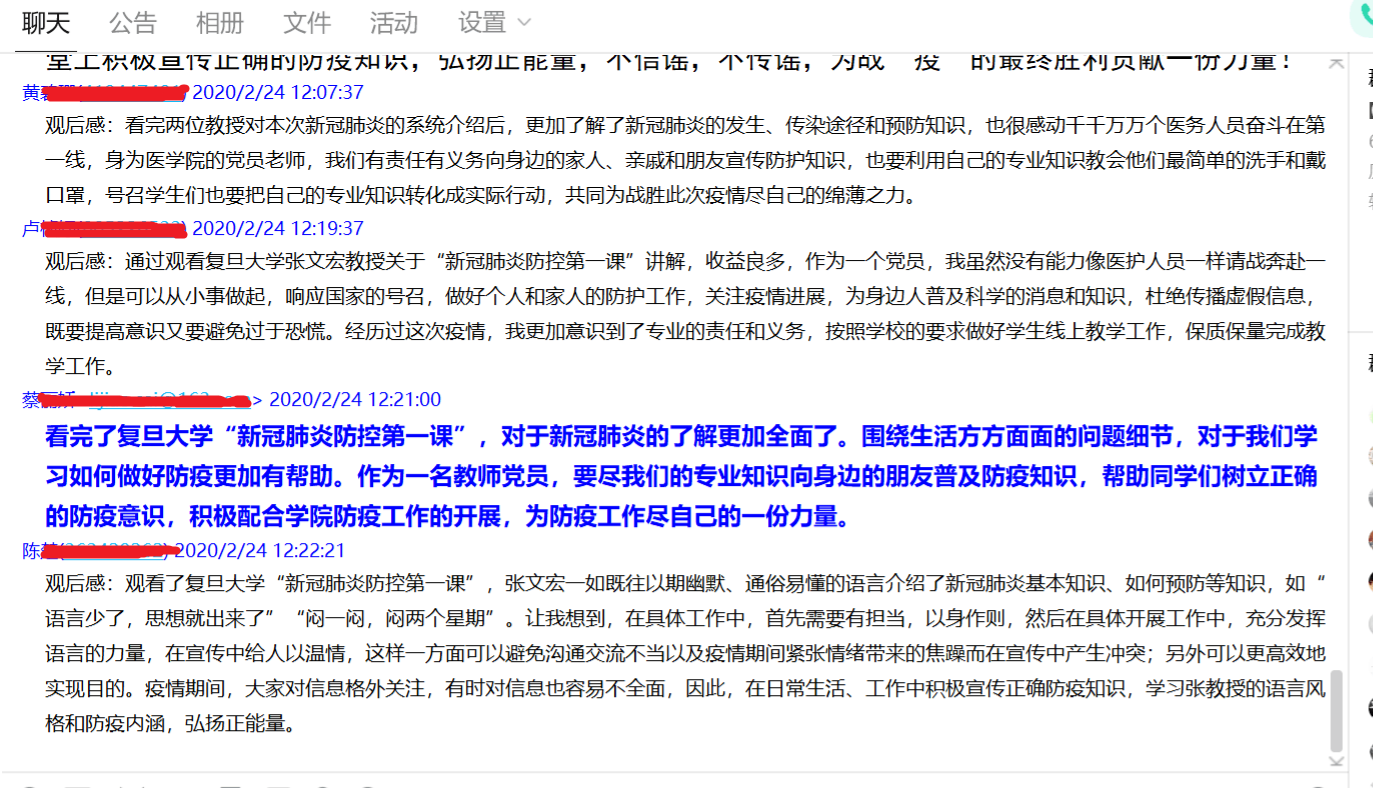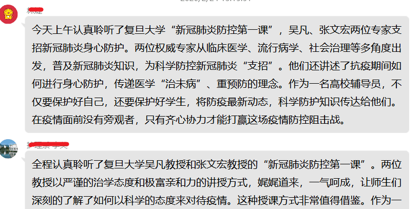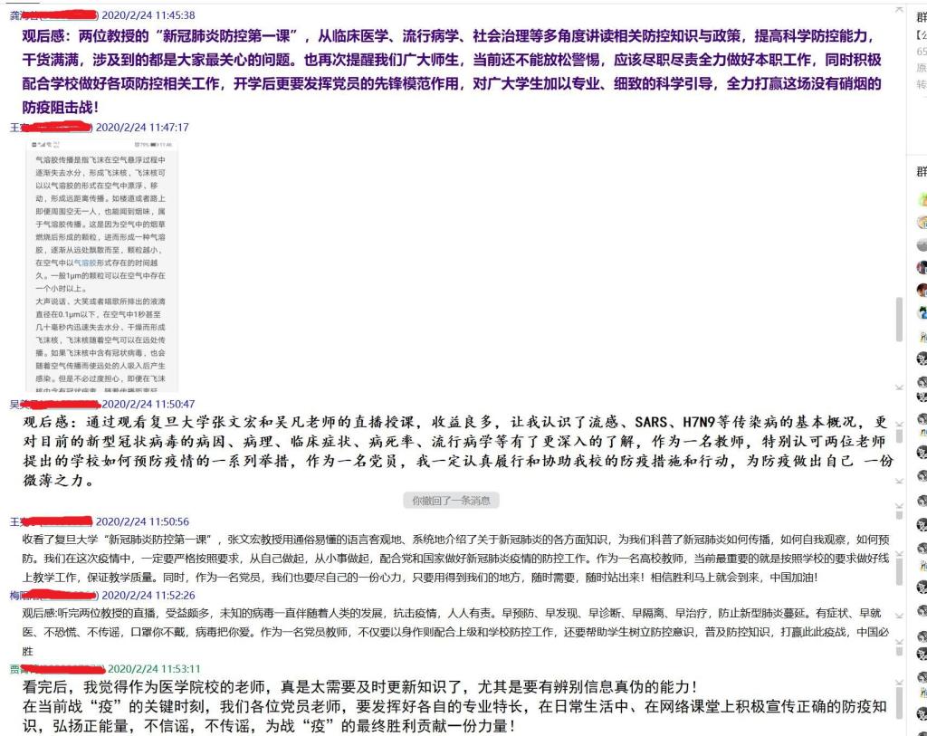 2020年2月24日上午,護(hù)理系全體師生在線觀看了復(fù)旦大學(xué)“新冠肺炎防控第一課”網(wǎng)絡(luò)直播課,線上聆聽“疾控女俠”吳凡和“硬核教授”張文宏兩位專家講述“新冠肺炎防控第一課”。線上聆聽完兩位專家的講授,護(hù)理系黨總支馬上組織黨員師生對“新冠肺炎防控第一課”進(jìn)行線上學(xué)習(xí)研討。黨員同志們針對今天的學(xué)習(xí)紛紛發(fā)表了各自的體會,收獲頗豐。