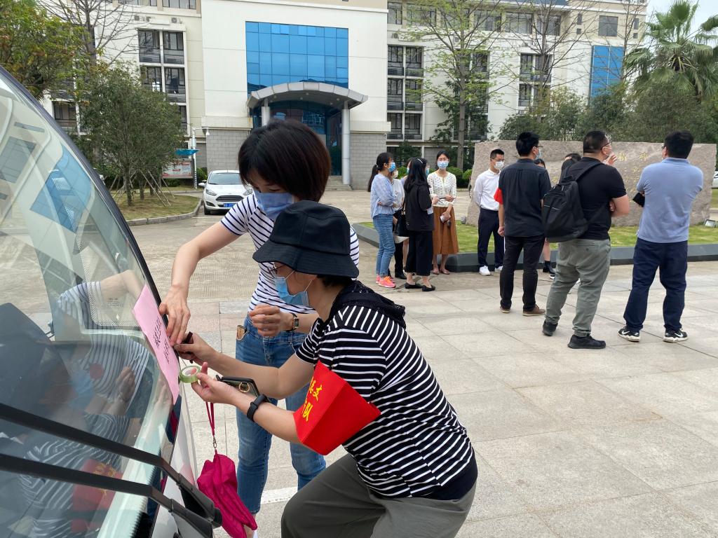 護(hù)理系黨總支黨員突擊隊(duì)隊(duì)長謝濤為接送學(xué)生車輛粘貼車標(biāo)