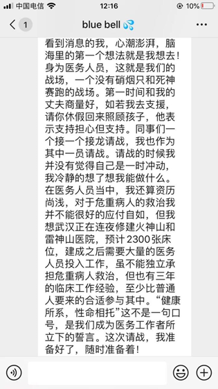她說:一方有難,八方支援,身為一個醫(yī)務(wù)人員的我,愿意沖在最前線,砥礪前行,武漢加油!我們與你同在!