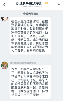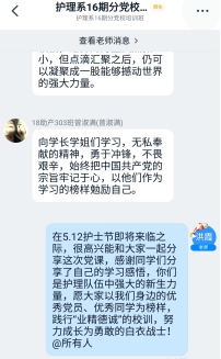 5月12日護士節(jié)來臨之際,護理系第二黨支部書記(雙帶頭人)洪霞老師充分把握育人契機,組織了一堂有政治高度、情感溫度和理論深度的“云”黨課,對護理系121名入黨積極分子們進行生命教育、信念教育、科學教育、道德教育,切實做好學生價值觀引領。