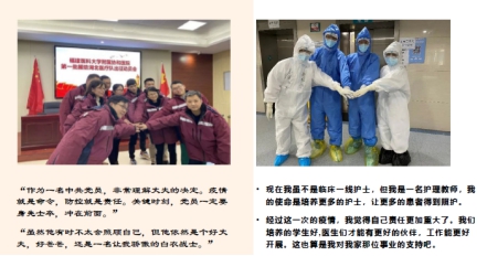 護理系第二黨支部書記(雙帶頭人)、內科護理教研室主任、2018年福建省名師培養(yǎng)人洪霞教授和護理系第二黨支部宣傳兼統(tǒng)戰(zhàn)委員、內科護理教研室講師向月,她們的丈夫都是此次福建省援鄂醫(yī)療隊的隊員。兩位職教黨員教師在得知她們的家人主動請纓馳援武漢抗擊疫情時,用她們樸實的言語和行動,默默支持和付出,詮釋她們對家、對鄉(xiāng)、對黨、對國的一片赤誠,也體現(xiàn)了作為共產黨員的責任和擔當。