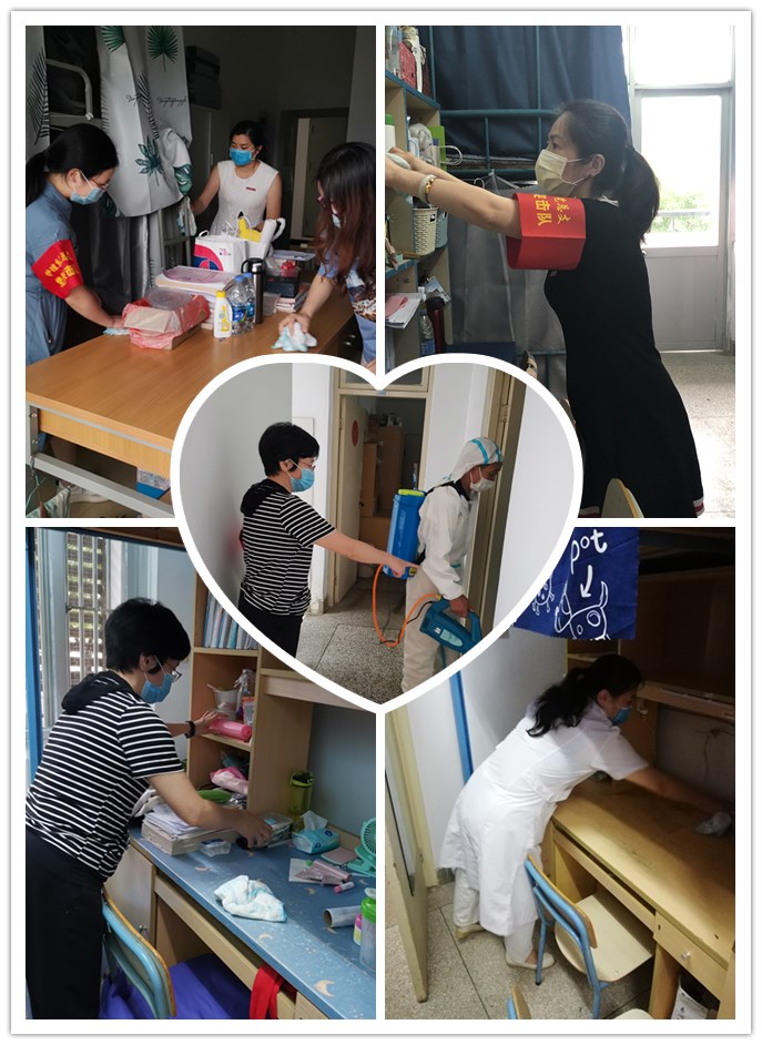 開窗通風(fēng)透氣,細心整理歸置物品,打包易濕易霉東西、收拾衣服、整理被子、擺齊桌椅、擦拭床架柜子、清潔窗戶、掃地拖地、清掃垃圾...... 在學(xué)生宿舍,老師們不畏臟,不怕累,擼起袖子干得熱火朝天。大家分工合作,默契配合,認真清理宿舍的每一個角落。并安排工作人員對宿舍進行全面消殺,為學(xué)生打造安全、衛(wèi)生的宿舍環(huán)境。