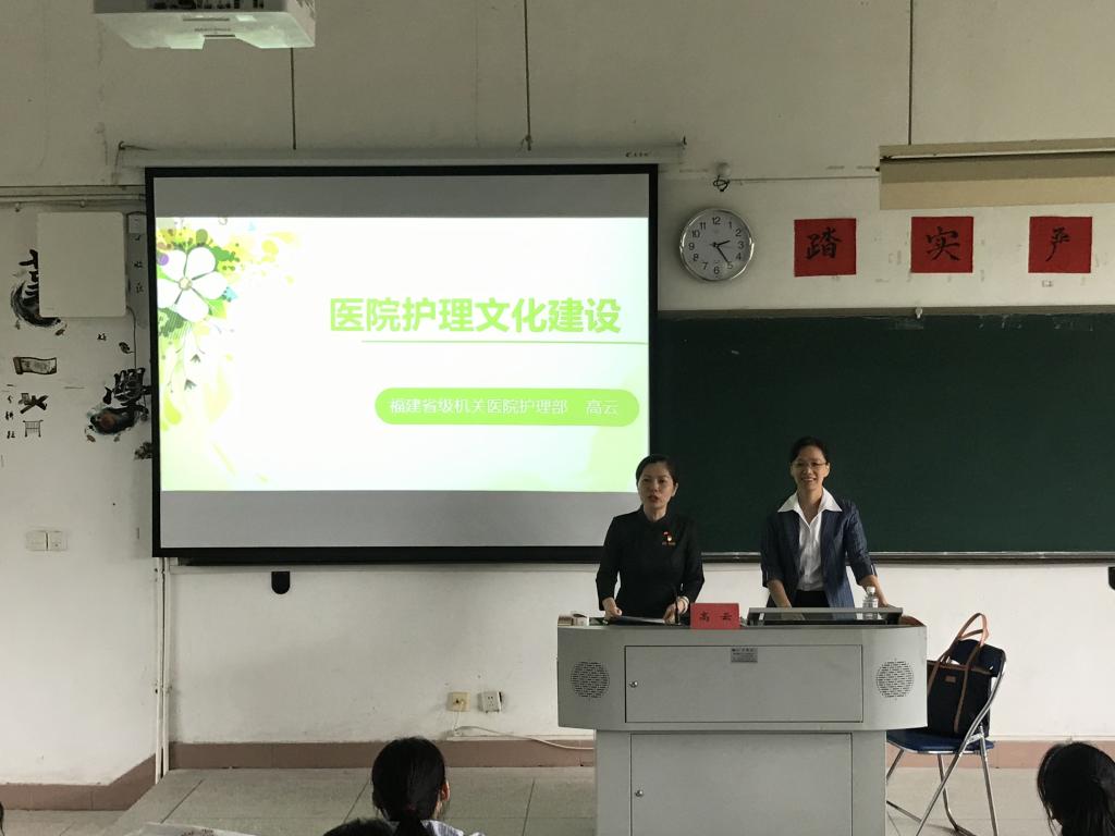 自《白衣天使文化融入護(hù)生思想政治教育的實(shí)踐探索》項(xiàng)目獲批到實(shí)施開展已歷兩年有余,在這過程中,我們以白衣天使文化為統(tǒng)領(lǐng),緊鑼密鼓的開展了形式多樣、內(nèi)容豐富的校園活動,根據(jù)項(xiàng)目前期計(jì)劃,特邀請福建省直機(jī)關(guān)醫(yī)院護(hù)理部主任兼院感科科長、福建省護(hù)理學(xué)會第八屆理事會理事——高云主任,于1015日為我系學(xué)生做《醫(yī)院護(hù)理文化建設(shè)》的講座。