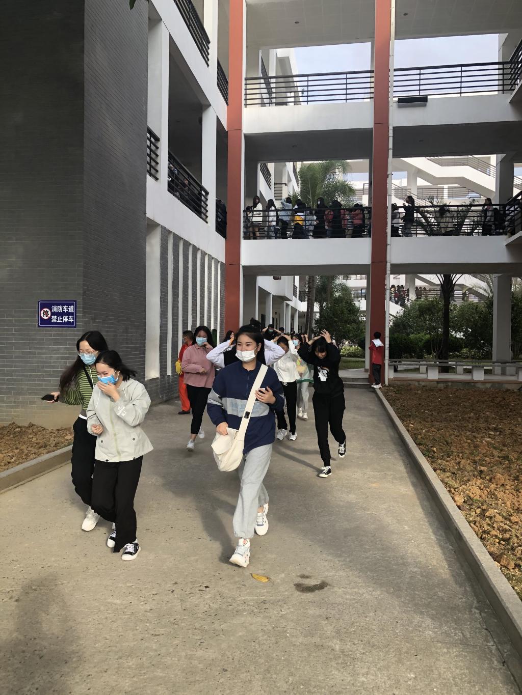 為保證演練順利開展,系部預(yù)先制定演練方案,明確演練步驟及人員,保衛(wèi)處林捷老師對參加演練的人員進(jìn)行了安全知識培訓(xùn),并進(jìn)行現(xiàn)場演示。下午3:30,教學(xué)樓黃煙四起、警報鈴響,各位老師迅速到達(dá)指定崗位,現(xiàn)場指揮發(fā)出第一次避險指令,學(xué)生根據(jù)演練要求,在課桌及墻角蹲下,等待現(xiàn)場指揮發(fā)出逃生指令;在現(xiàn)場指揮發(fā)出逃生指令后,學(xué)生們紛紛用手、濕紙巾等捂住口鼻,彎著腰從預(yù)定的逃生路線進(jìn)行撤離,撤退過程井然有序,僅用3分鐘,參加本次演練的1000多名學(xué)生全部安全撤離到指定區(qū)域。