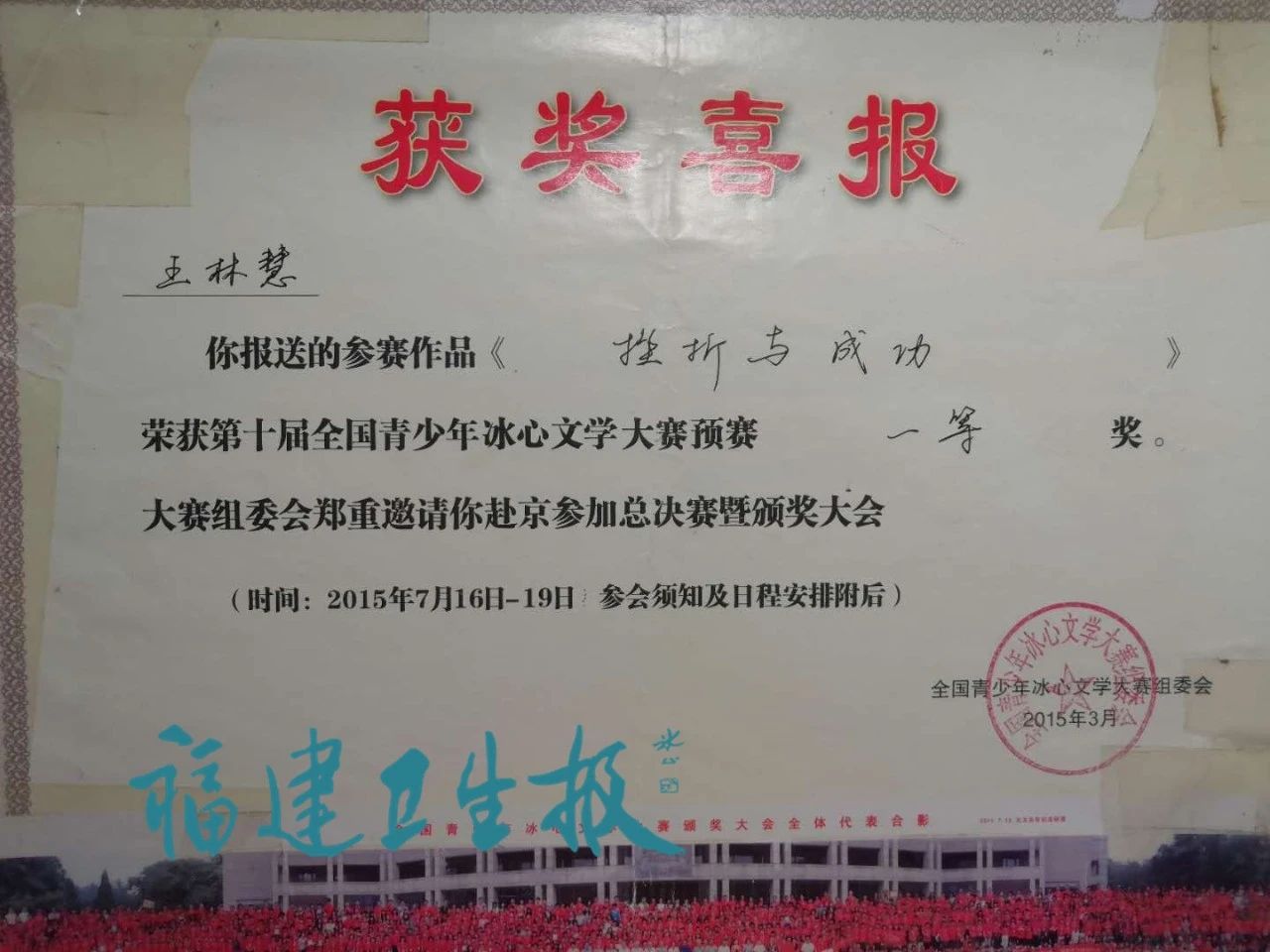 王林慧成績(jī)優(yōu)異,連年獲得獎(jiǎng)學(xué)金,被評(píng)為“三好學(xué)生”等榮譽(yù)稱號(hào)。放假期間,她還積極參加社會(huì)實(shí)踐活動(dòng),結(jié)合專業(yè)所學(xué)盡力幫助他人。曾獲得“美德少年”、“自強(qiáng)之星”等榮譽(yù)稱號(hào)。曾獲第十屆全國(guó)青少年冰心文學(xué)大賽預(yù)賽一等獎(jiǎng)。近日,在寧德市“爭(zhēng)做新時(shí)代向上向善好青年”主題活動(dòng)中,她還入選崇德守信好青年。