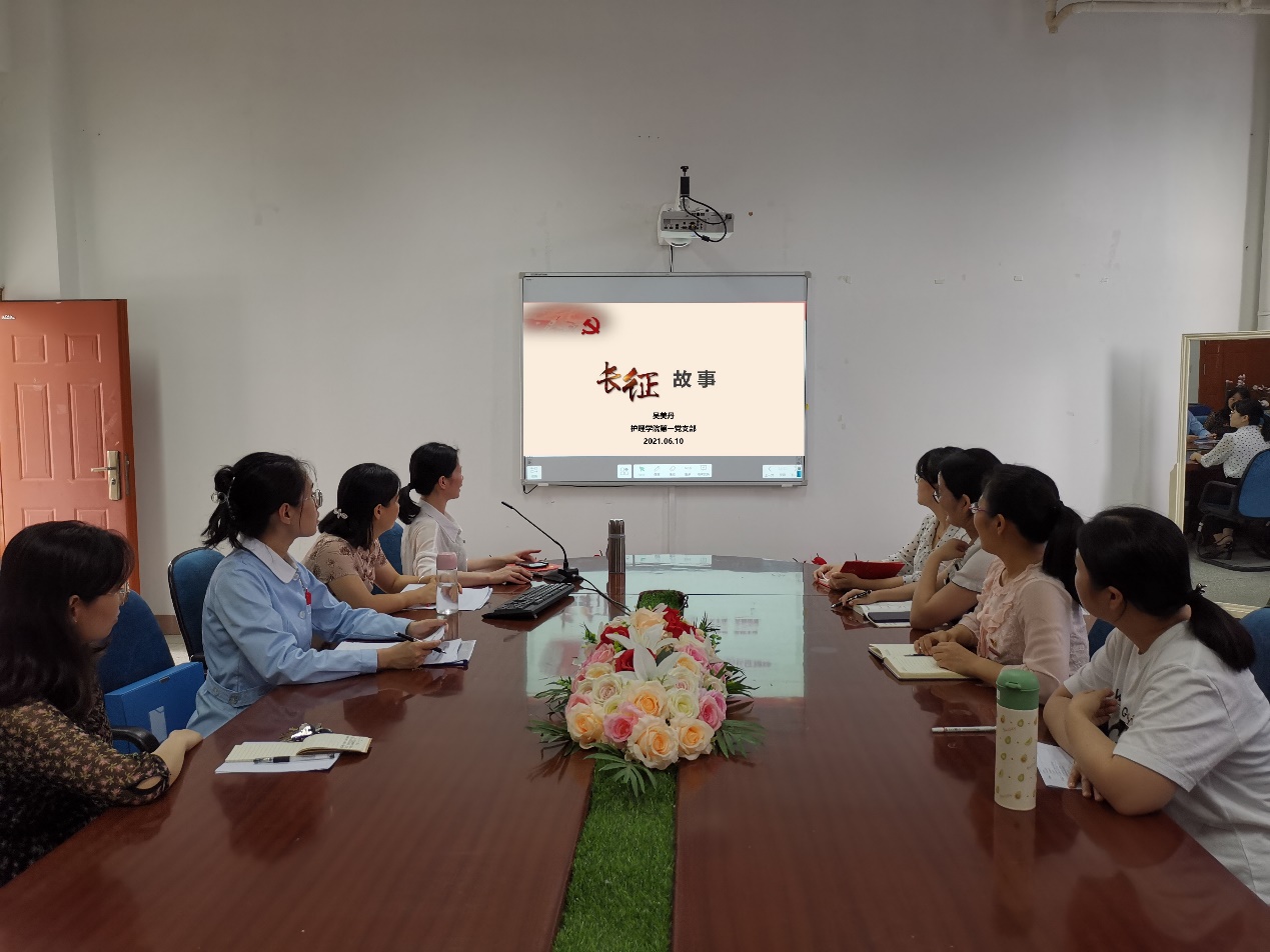 2021年6月10日,護(hù)理學(xué)院第一黨支部在護(hù)理學(xué)院301會(huì)議室開展“賡續(xù)長(zhǎng)征精神 凝聚前進(jìn)力量”——長(zhǎng)征故事專題黨課,本次黨課由護(hù)理學(xué)院第一黨支部“雙帶頭人”吳美丹主講。