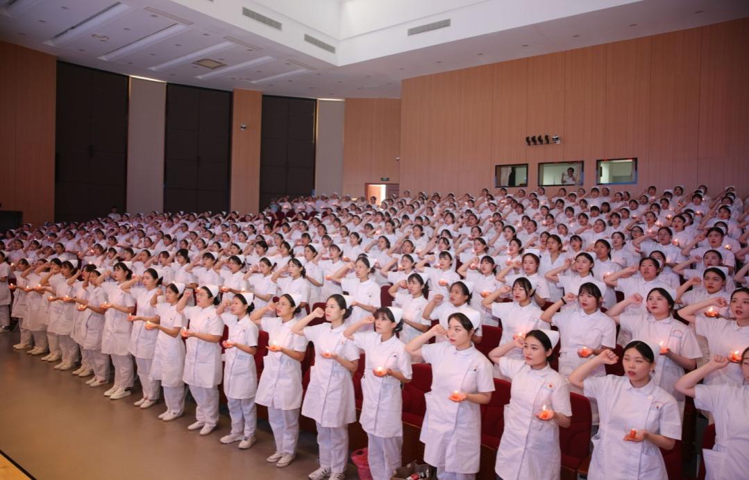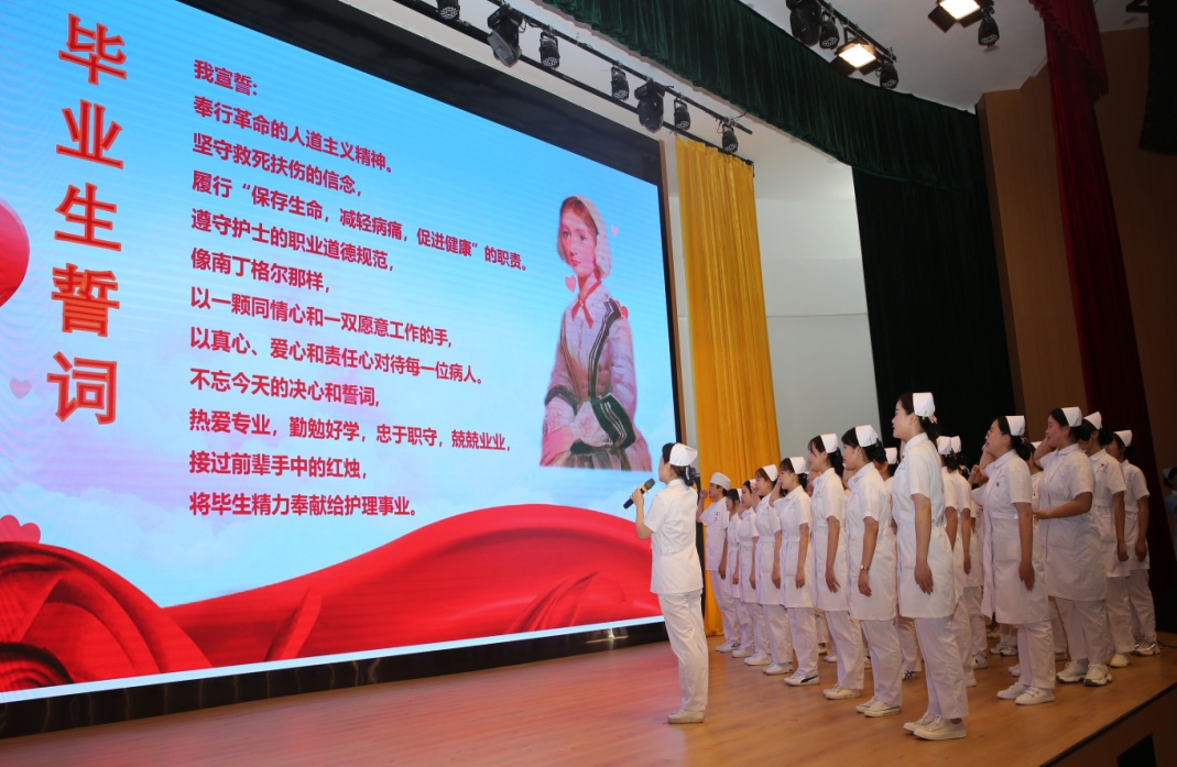 畢業(yè)生們手捧紅燭,舉起右手莊嚴(yán)宣誓:“……熱愛(ài)專(zhuān)業(yè),勤勉好學(xué);忠于職守,兢兢業(yè)業(yè);接過(guò)前輩手中的紅燭,將畢生精力奉獻(xiàn)給護(hù)理事業(yè)……”鏗鏘有力的聲音久久縈繞在會(huì)場(chǎng)上空,昭示著她們正式加入白衣天使的行列。