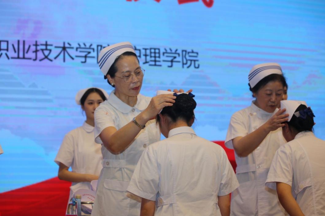 緊接著伴隨著柔美的音樂(lè)進(jìn)行神圣的授帽傳光儀式。在護(hù)理學(xué)創(chuàng)始人南丁格爾像前,護(hù)理前輩們?yōu)閱蜗ス蛑漠厴I(yè)生逐一戴上象征著圣潔天使的燕尾帽,畢業(yè)生接過(guò)前輩手中象征南丁格爾精神的奉獻(xiàn)之火。白色的燕尾帽在紅色燭光的映襯下,猶如神圣的光環(huán)照耀在每一個(gè)現(xiàn)場(chǎng)師生的心中。