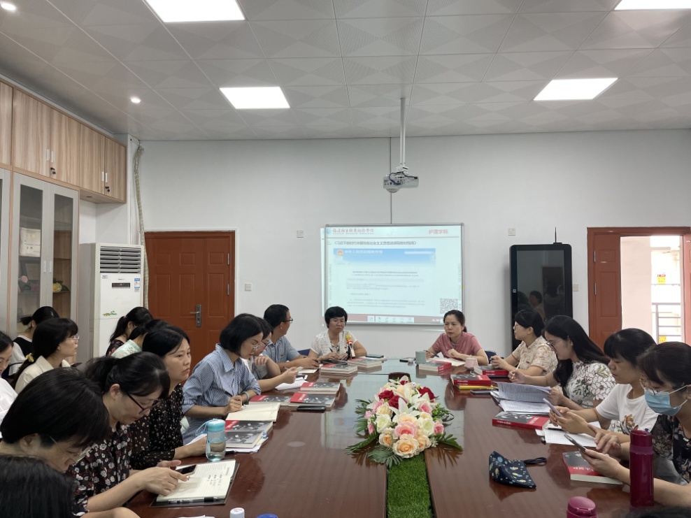 為全面貫徹黨的教育方針,落實(shí)立德樹(shù)人根本任務(wù),扎實(shí)推進(jìn)習(xí)近平新時(shí)代中國(guó)特色社會(huì)主義思想進(jìn)課程教材,2021年9月1日,護(hù)理學(xué)院召開(kāi)系部會(huì)議,會(huì)上學(xué)習(xí)了《關(guān)于深入學(xué)習(xí)宣傳貫徹黨的教育方針的通知》和《習(xí)近平新時(shí)代中國(guó)特色社會(huì)主義思想進(jìn)課程教材指南》。會(huì)議由護(hù)理學(xué)院黨總支書(shū)記謝濤主持,護(hù)理學(xué)院全體教師參加。