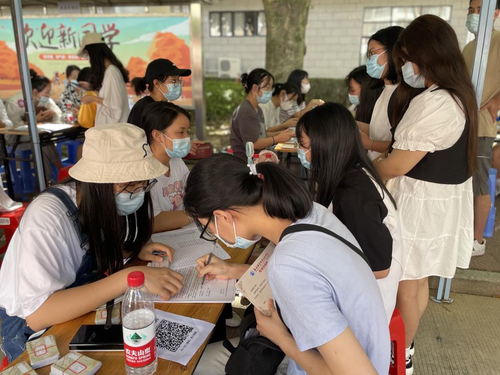 迎新帳篷下,學(xué)長學(xué)姐耐心講解報(bào)到流程,耐心叮囑填寫好每一份資料,話語輕柔,讓這場初識格外溫暖。