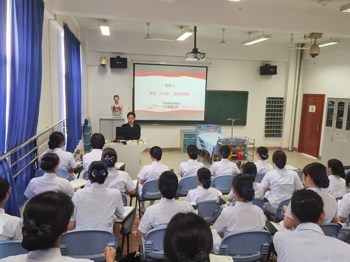 為貫徹落實(shí)黨的教育方針,扎實(shí)開(kāi)展黨史學(xué)習(xí)教育,2021年5月14日,護(hù)理學(xué)院院長(zhǎng)龔海蓉為護(hù)理學(xué)子講授《收官十三五 實(shí)現(xiàn)新跨越》形勢(shì)與政策課。