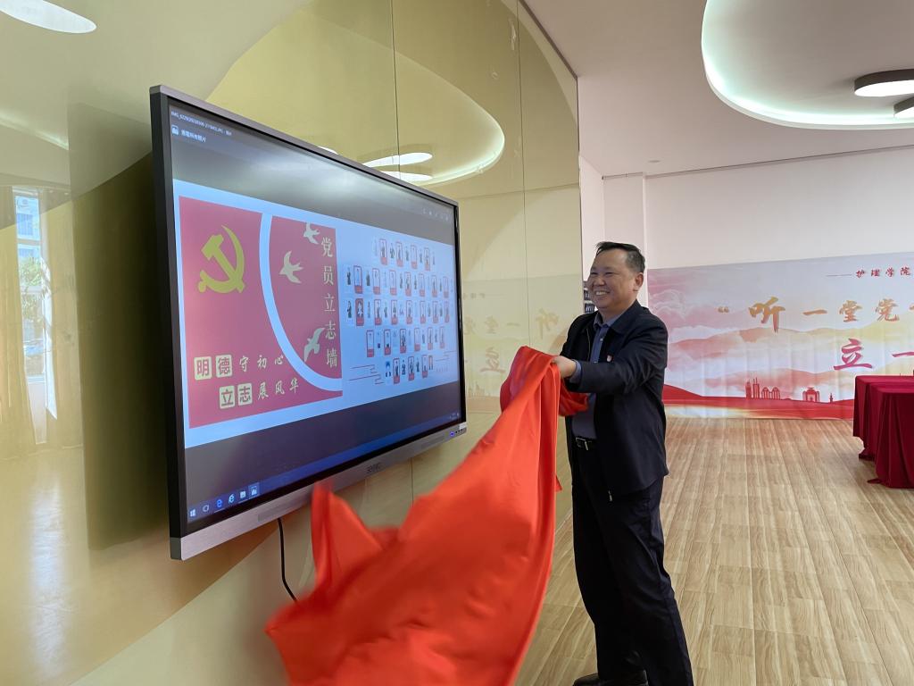 贈書儀式后,曾武祈為黨員立志墻揭幕,并向大家送上了節(jié)日的祝福,同時他結(jié)合本次活動對全體教師提出希望,希望大家亮身份、明志向、言行如一,爭做一名有溫度、有溫情的職教先生,為護理教育事業(yè)發(fā)展貢獻(xiàn)自己的力量。