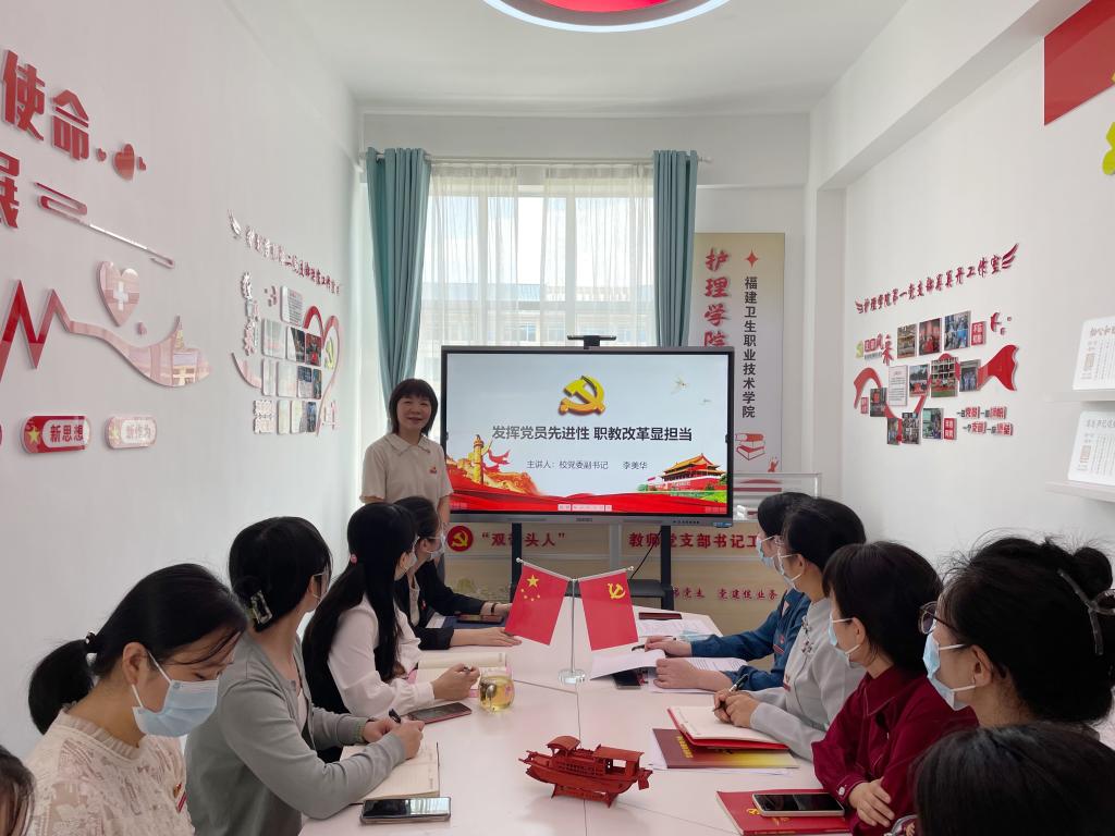 為護理學院第一黨支部講授《發(fā)揮黨員先進性 職教改革顯擔當》專題黨課。她從共產黨員的先鋒模范、我們身邊的模范事跡、雙高建設改革擔當三個方面帶領大家學習如何在實際工作中發(fā)揮共產黨員先鋒模范作用。激勵教師黨員在學校全面深化綜合改革的路上,發(fā)揮光榮的歷史使命與歷史責任,循著業(yè)精德誠的校訓、伴著教書育人的職責、不忘初心、牢記使命,努力創(chuàng)先爭優(yōu),為護理職業(yè)教育高質量發(fā)展積極貢獻力量!