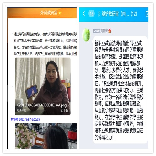 學(xué)習(xí)結(jié)束后,各教研室組織成員開展線上學(xué)習(xí)研討,分享心得體會。老師們表示,通過此次學(xué)習(xí)更加深刻地認(rèn)識到職業(yè)教育在培養(yǎng)高素質(zhì)技術(shù)技能人才、提升人才職業(yè)技能與專業(yè)知識等方面的關(guān)鍵作用,也對國家職業(yè)教育政策和理論的豐富內(nèi)涵和精神實(shí)質(zhì)有了更加全面的理解;作為職業(yè)教育工作者,將深度踐行新職業(yè)教育法的改革理念,并融入實(shí)際課堂教學(xué)和學(xué)術(shù)研究中,為社會培養(yǎng)更多高素質(zhì)技術(shù)技能人才。
