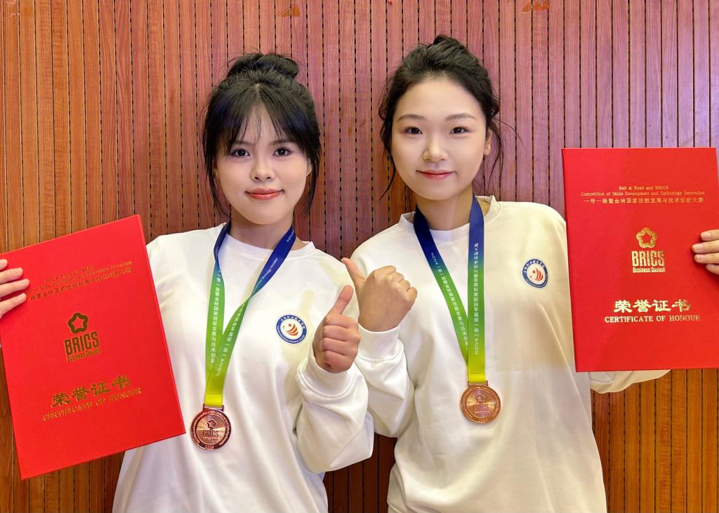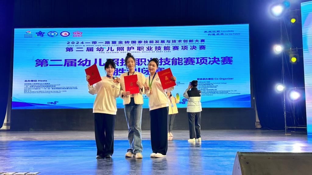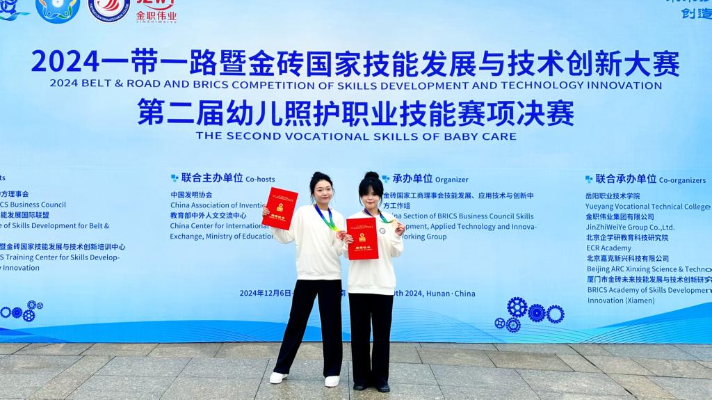 本次大賽由金磚國家工商理事會中方理事會、“一帶一路”暨金磚國家技能發(fā)展國際聯(lián)盟、中國科協(xié)“一帶一路”暨金磚國家技能發(fā)展與技術(shù)創(chuàng)新培訓(xùn)中心主辦,岳陽職業(yè)技術(shù)學(xué)院、金職偉業(yè)集團(tuán)有限公司等聯(lián)合承辦。此前,我校師生參加11月15日至17日在南昌職業(yè)大學(xué)舉辦的2024一帶一路暨金磚國家技能發(fā)展與技術(shù)創(chuàng)新大賽第二屆幼兒照護(hù)職業(yè)技能賽項(xiàng)區(qū)域選拔賽(第八場),從62支隊伍、90余名選手中脫穎而出,陳萱萱、梁安宏獲高職組團(tuán)隊二等獎,李馨老師獲教師組三等獎。