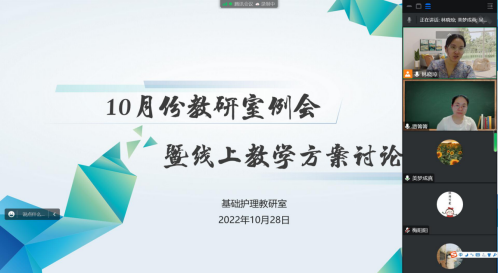 按照校領導的囑托,護理學院不斷調整優(yōu)化線上授課準備工作,基礎護理教研室全體老師在騰訊會議上召開 “互助共享,提高線上實訓教學有效性”線上教學方案討論會。大家結合以往線上實訓教學存在的問題進行交流、積極反思、各抒己見,針對實操課用物場地受限和師生互動受影響兩大突出問題,老師們?nèi)翰呷毫Γ餐杏懡鉀Q問題的方案,通過靈活調整教學進度,直播時開啟攝像頭、連麥互動等方式保證教學效果。