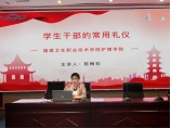 陳梅欽老師在提升學生干部素質和能力上,提出“1+2+3+4+5”新時代學生干部模式,希望學生干部時刻保持為同學全心全意服務的初心,以身作則,樹立良好榜樣。另外,陳梅欽老師針對學生干部常用禮儀,強調學生干部應加強言語表達、規(guī)范待人接物禮儀、會議禮儀等,希望在未來成長道路上,展現(xiàn)良好的形象和素養(yǎng),樹立正確的價值觀和行為準則。