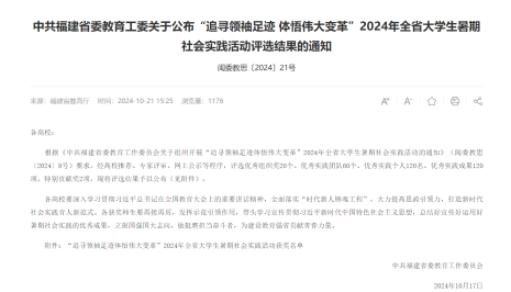 正是這份執(zhí)著與擔當,讓元欣怡在眾多參與者中嶄露頭角,榮獲福建省教育廳“追尋領袖足跡,體悟偉大變革”優(yōu)秀實踐學生榮譽稱號。這一榮譽不僅是對她個人努力的肯定,更是對所有積極投身社會實踐的學子們的鼓勵。
