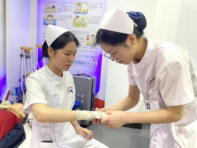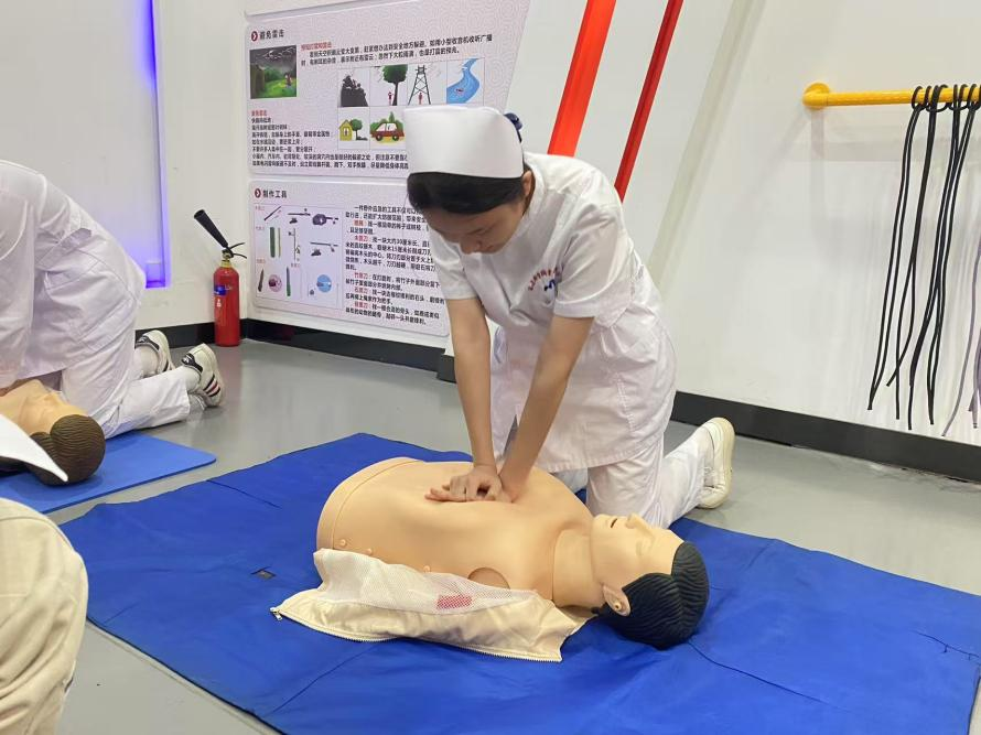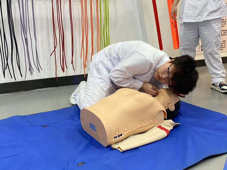 第二環(huán)節(jié)急救包扎與CPR技能操作練習(xí)于4月20日—21日在紅十字會(huì)生命教育體驗(yàn)學(xué)堂進(jìn)行,同學(xué)們動(dòng)作嫻熟,用著螺旋反折法處理“手臂傷口”,指尖壓緊繃帶起點(diǎn),每繞一圈便精準(zhǔn)翻折一次,繃帶邊緣整齊如尺量,最后仔細(xì)調(diào)整松緊度后交予工作人員檢查指導(dǎo),同時(shí)在CPR區(qū)的同學(xué)在標(biāo)準(zhǔn)進(jìn)行30次連貫的胸外按壓后,立即托起“傷員”下頜,捏住鼻子,吹氣兩次,動(dòng)作干凈利落。練習(xí)現(xiàn)場(chǎng)既緊張認(rèn)真又充滿(mǎn)活力,同學(xué)們專(zhuān)注操作,默契配合,富含濃厚的學(xué)習(xí)氛圍。