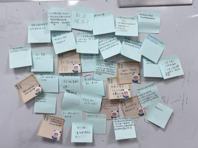 提問環(huán)節(jié)過后,現(xiàn)場熱度未減。同學們紛紛拿起筆,在便簽上寫下內(nèi)心感悟、未來憧憬及對學校的建議。隨后,便簽被鄭重貼在權益白板墻上,這面墻猶如希望的燈塔,見證著同學們的心聲,為成長之路增添一抹亮色。