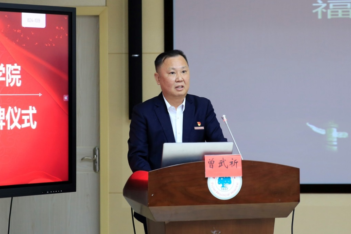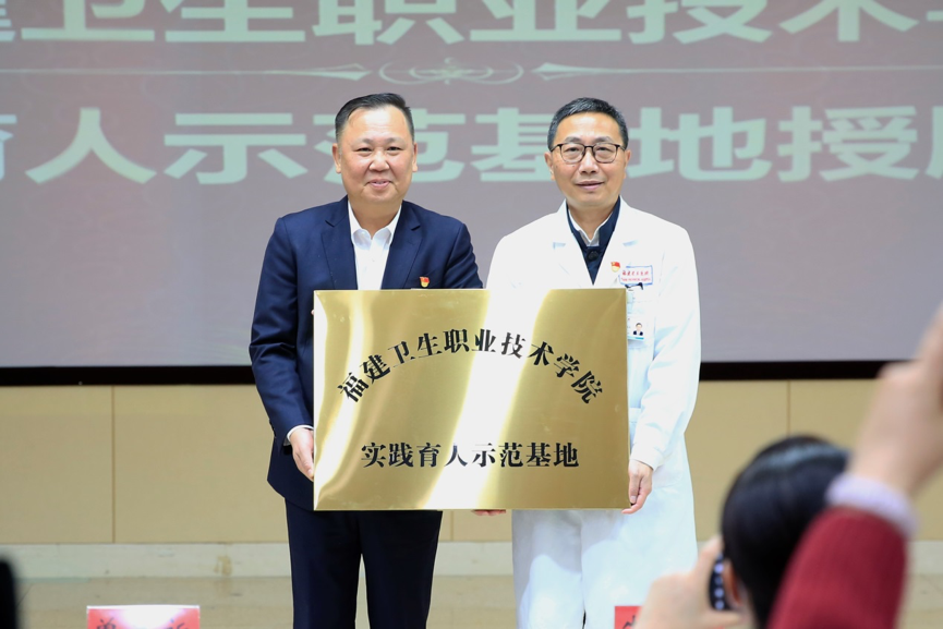 曾武祈代表學(xué)校向福建省立醫(yī)院授予“福建衛(wèi)生職業(yè)技術(shù)學(xué)院實踐育人示范基地”的牌匾。