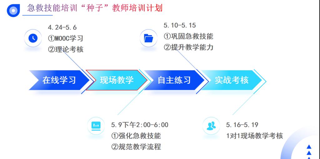 本次培訓(xùn)分為在線學(xué)習(xí)、現(xiàn)場(chǎng)教學(xué)、自主學(xué)習(xí)、實(shí)戰(zhàn)考核等幾個(gè)階段,31名“種子”教師將接受成人心肺復(fù)蘇術(shù)(CPR)和自動(dòng)體外除顫儀(AED)技能培訓(xùn)。