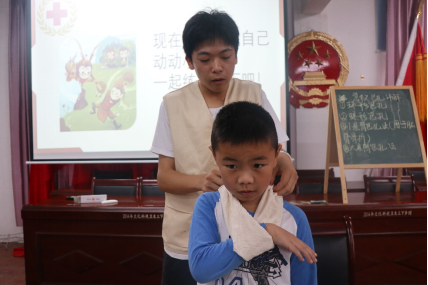 關愛鄉(xiāng)村兒童,共筑健康中國夢。實踐團教育關愛小分隊的志愿者們屏南縣棠口村開展愛心支教活動,急救包扎、兒童防騙、傳統(tǒng)養(yǎng)生功夫、繪畫夢想、衛(wèi)生常識、兒童營養(yǎng)……志愿者與孩子們共同編織著一個七彩的夢?!拔医K于知道受傷流血的時候怎么去止血,怎么減輕自己的疼痛感了?!眰鹘y(tǒng)養(yǎng)生功法課上,“我也來一個,我也來一個……”小朋友們紛紛要求露一手。夢想繪畫課上,孩子們繪就醫(yī)生、老師、特種兵、超人宇航員等,從他們的繪畫中,志愿者們也感受著孩子的童真與偉大夢想?!班?,我們要緊跟著爸爸媽媽,不能被壞人用糖果騙走。”兒童防騙課上,小朋友小丁這樣認真地說。孩子們用稚嫩的話語和志愿者們暢想未來,在孩子們堅定的眼神里我們相信我們心中的健康夢、中國夢一定會實現(xiàn)。