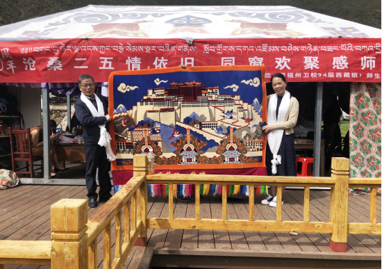 最后,校友們?yōu)槟感+I(xiàn)上藏族編織掛毯,感激母校領(lǐng)導(dǎo)和老師能應(yīng)邀參加此次慶典,感恩母校當(dāng)年的悉心培養(yǎng),共同祝福母校的明天越來(lái)越好。