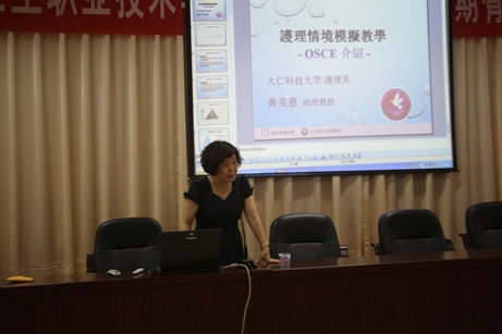 4月29日下午臺(tái)灣大仁科技大學(xué)護(hù)理系主任黃美惠助理教授應(yīng)邀蒞臨我院開展題為《護(hù)理情境模擬教學(xué)—OSCE介紹》的專題講座,院長(zhǎng)郭素華、副院長(zhǎng)廖偉堅(jiān)以及教職員工、學(xué)生代表100多人聆聽了本次講座,講座由護(hù)理系書記謝濤副教授主持。