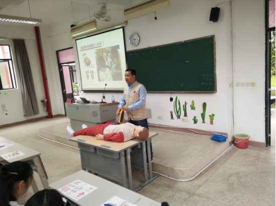 鄭明華老師向同學(xué)們介紹了福建省紅十字會(huì)應(yīng)急救護(hù)工作的概況及掌握應(yīng)急救護(hù)技能的重要性和必要性。他用特有的生動(dòng)和詼諧風(fēng)格,為同學(xué)詳細(xì)講解了多種應(yīng)急救護(hù)方案,細(xì)致地為同學(xué)們介紹了心肺復(fù)蘇術(shù)的適用場(chǎng)景和操作要點(diǎn),借助安妮假人現(xiàn)場(chǎng)示范,展示如何呼救、如何正確撥打急救電話、召集大家共同參與急救、胸外按壓、開放氣道、人工呼吸等一系列操作,同時(shí)現(xiàn)場(chǎng)演示了AED除顫儀的使用方法,為同學(xué)們帶來了實(shí)用的一課。